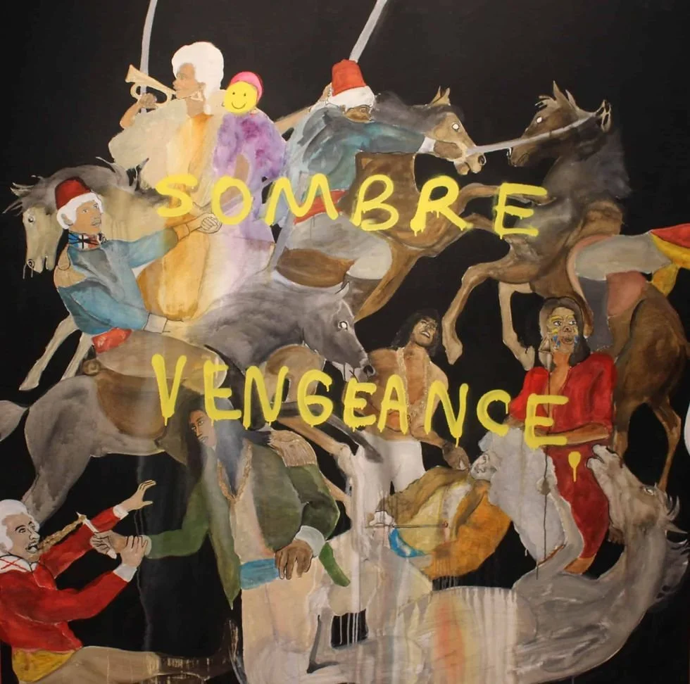 Sombre Vengeance. An equestrian death dance born out of desperation and lack of functioning diplomacy. The end result of not really trying but it’s difficult to look away; acrylic and spray paint on canvas; 6’ X 6’; 2018