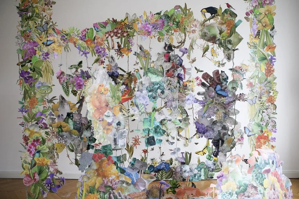 Celeste’s immersive work reflects her commitment to raising awareness about our many looming environmental crises through honoring nature and history. Each installation is something of a biosphere — immense, delicate, and intricate inter-weavings of collaged flora and fauna comprised of hundreds, maybe thousands, of hand-cut vintage naturalist illustrations from the 1900s. The result is a safe, beautiful world in which Mother Nature is revered, not punished. It’s Berlin-based Celeste’s form of environmental activism, her way of preserving life as we know it before it goes extinct. “I use pre-industrial illustrations to both inspire viewers with the beauty of the natural world as it was before the extinction crisis and also to highlight how very threatened our biodiversity is,” Celeste says. “Many species are extinct or going extinct in my artworks. Additionally, I also want to remind people that we are all interconnected with biodiversity and that we are part of these ecosystems — we are nature, not separate from it — and our survival and futures are intertwined.” Her whimsical work has been featured in O, the Oprah Magazine and The Guardian, licensed by Crate & Barrel, and can be seen on wine bottles and in storefronts.